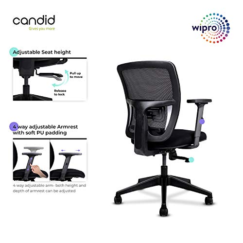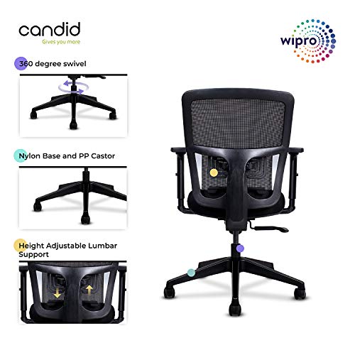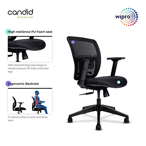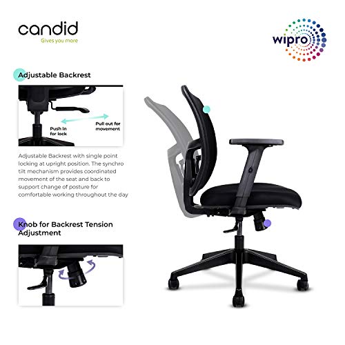 Ergonomically engineered Synchro Tilt mechanism allowing users to tilt even while resting their feet on the floor. Fabric upholstered office chair with Adjustable Seat Height and Adjustable Armrests