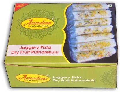 Pootharekulu or poothareku is a popular Indian sweet from the Andhra Pradesh state of south-east India. This is wrapped in a wafer-thin rice starch layer resembling paper and is stuffed with Sugar, dry fruits and nuts. This Sweet is popular for festivals, religious occasions and weddings in the Telugu states.Pootherekulu, also known as paper sweet is a unique product of Andhra Pradesh.Initially Poothareku was mostly consumed by royal families and distributed to the people during festivals and any celebrations.Its paper thin consistency makes it light on the tummy and this variant comes with Ghee and Sugar and makes it a nice light sweet indulgence.