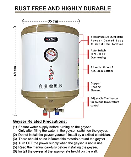 HIGHEST SAVINGS AND PRODUCT QUALITY : BEE 5-star rated with Advanced heat resistant Technology for Power Savings.first in class Glass-Coated double weld Heating Element to prevent scale formation and extend the life of heating element. ACTIVA GEYSERS comes with Temperature meter which shows indication of rise and fall in hot water for ease of life.Double Protection with Thermal Cut-Out and Multi-function Safety Valve. Perfect if you want to go green