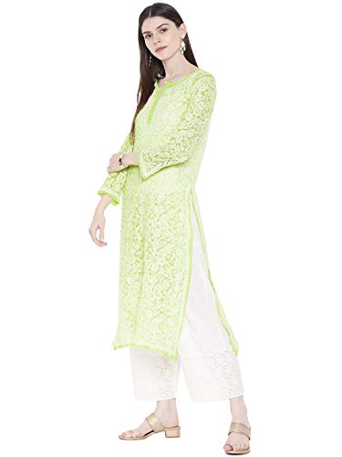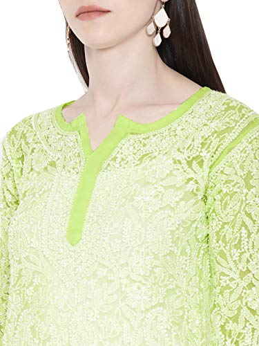 Touch and Feel : Soft and Soothing Sleeves – Full Styled elegantly , from heart of Lucknow , this magnificent Green faux georgette fully embroidered stitched is presented. The motifs are crafted with an intricate hand embroidered chikan stitches , such as , ` Bakhiya’ , `Keel kangan’ and `Phanda’ using white cotton thread which completely gives a nawabi appearance , and make you stand apart from the crowd . One can club it with palazzos , narrow pants or cigarette pants with matching pumps . The images shown are for illustration purpose . Motifs of embroidery may vary . , At Ada we are dealing with needle craft which is GI mapped and recognized by Trips internationally which is multiple washed leaving the product free of colour bleeding and shrinkage. Since products are pre washed they cannot match the artificial quote / finish of a factory finish.