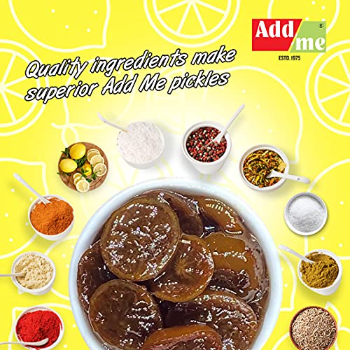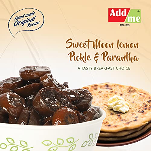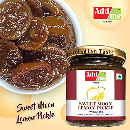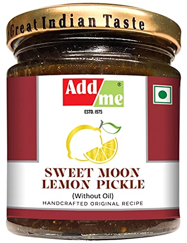 Addme lemon Pickle is Sweet & Sour Aged Lemon Pickle. Its distinct black/brown color is due to ground spices used. Aging changes color but enhances taste & Flavor. Very good for digestion. Buy Addme sweet moon lemon pickle today.