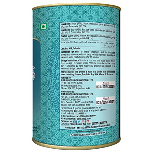 RASGULLA(EB)-1.25KG- Milk-solid ball dumplings in sugar syrup. Sugar (47%), Edible Vegetable Oil (Palmolein Oil), Refined Wheat Flour, Gram Flour, Almonds (0.4%), and Pistachio (0.1%), Cardamom.