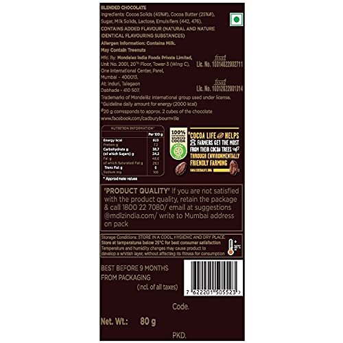 Bournville rich cocoa chocolate is irresistible and specially created to savour the palate with 70% cocoa and a smooth texture, each little chunk is dark with rich cocoa offering that allows you to end your day on a perfect note! This pack contains 3 units of Cadbury Bournville 70% dark, 80g each.