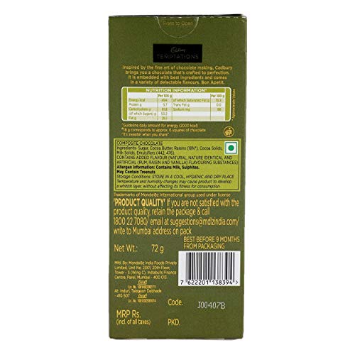 Cadbury Temptation Rum and Raisin Chocolate, 72 g