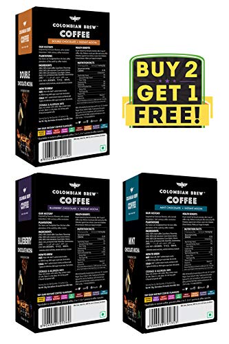This is an elegant pack of double chocolate mocha 50g, mint chocolate mocha 50g, blueberry chocolate mocha 50g. made with handpicked 100% pure coffee beans and cocoa beans. Colombian brew is inspired by Francisco Romero, a priest in mid-16th century Colombia that started its coffee revolution. Colombian brew coffee is sourced from best coffee bean plantations in the world.