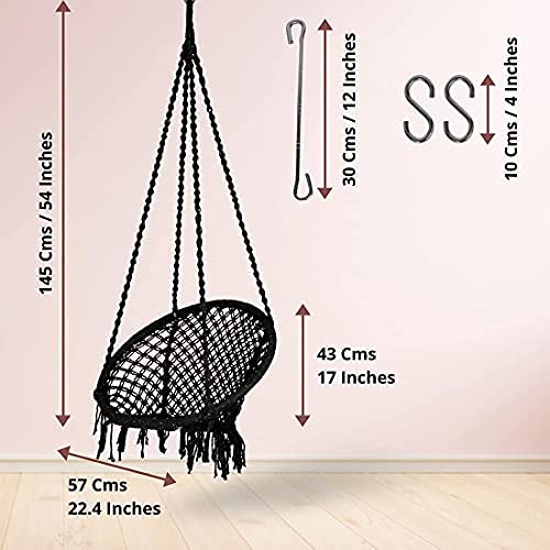 Durable – Hanging Curio Centre Net Chair Made of 100% handmade cotton which holds up to 100 Kgs Capacity with a toughness dimension of about 57 cm X 43 cm X 145 cm (Height of chair, without a rope, is 43cm). Accessories are made up of Heavy-duty stainless steel.