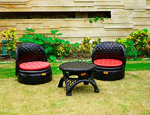 Get a vibrant surrounding with this piece of furniture from the house of De'dzines. This table and chair set is made from reused rubber tyres and comes across as a durable product to use. The set consists of 2 chairs and a coffee table.