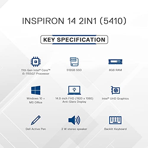 Dell 14 (2021) i5-1155G7 2in1 Touch Screen Laptop, 8GB, 512GB SSD, Win 10 + MS Office, 14.0″ (35.56 cms) FHD Display, Backlit KB, FPR + Active Pen, Platinum Silver (Inspiron 5410, D560594WIN9S)