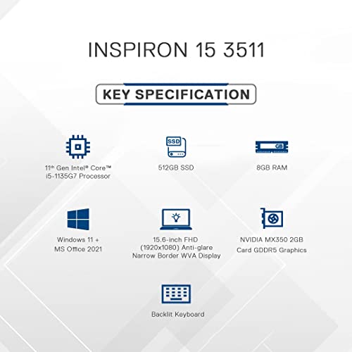 The speed you need: Featuring 11th Gen Intel Core i5 processor with 512GB SSD storage for a more responsive and quieter performance. Just your type: Get an expansive keyboard with a numeric keypad, 6.4% larger keycaps and a spacious touchpad that makes it easier to navigate your content. All day any day: Work in comfort thanks to a lift hinge that raises your device to an ergonomic angle, which provides a more comfortable typing angle. Easy on the eyes: Dell ComfortView Low Blue Light (LBL) solutions help reduce harmful blue light emissions and optimise eye comfort over extended viewing. More to see: Get more screen in a 15.6" laptop with three-side narrow borders for an immersive FHD viewing experience.