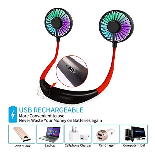 3 SPEED ADJUSTABLE & USB RECHARGEABLE : This Hand free personal fan has low/medium/high 3 speeds level. The cooling fan with powerful airflow makes it a must-have in the summer. 1800mAh lithium upgraded version of battery make it lasts longer, the USB cable that comes with the fan compatible with any USB port. 1-2 hours fast charging, 2-4 hours working time depends on different speed.