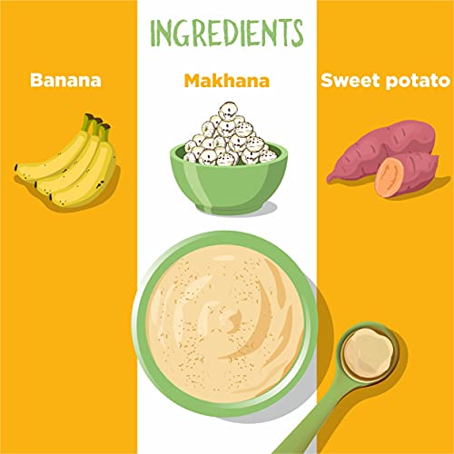 DID YOU KNOW- Makhana is a gluten free grain rich in calcium, protein, antioxidants, fibre making it an idle grain for starting solids. Makhana is beneficial in maintaining the overall health of growing babies. This immunity boosting grain also aids brain development. Banana and Sweetpotato are rich source of Fibre, MutliVitamins which are good for digestion, skin and hair. They also help in healthy weight.