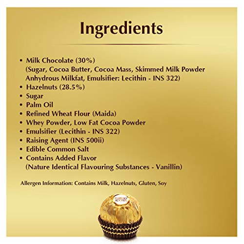 Ferrero Rocher offers a unique taste experience of contrasting layers that engages all the senses -a whole crunchy hazelnut in the centre, a delicious creamy chocolate hazelnut filling, a crisp wafer shell covered with chocolate and gently roasted hazelnut pieces. Each Ferrero Rocher has the inimitable golden wrapper and paper cup that make it even more special. The ideal delicacy that invites you to take the time to savour and share more of life’s golden pleasures together. Ferrero Rocher, the golden experience.