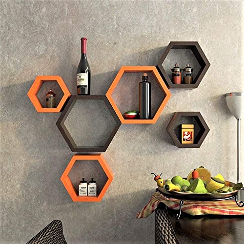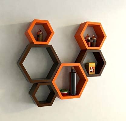 Color Orange and Brown Product Dimensions 27 x 27 x 27 cm Is Assembly Required Yes Assembly Type DIY Installation Type Wall Mount Primary material Engineered Wood Finish Type Glossy Painted Style Modern Capacity Medium Number of Pieces 6 What is in the box? Wall Plugs, Wall Screws Item Shape Hexagonal Shelf Material Wall Mount Shelf Number of Shelves 1 Item Model Number Wallself009 Manufacturer Furniture Cafe