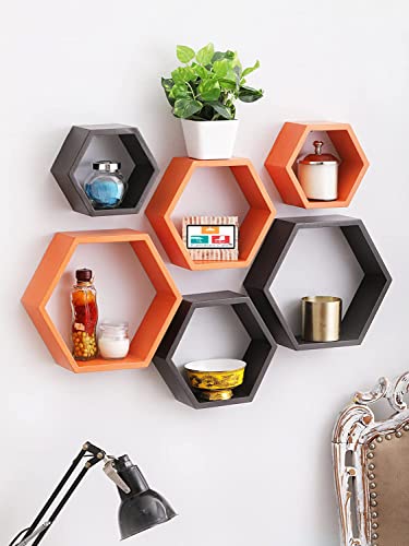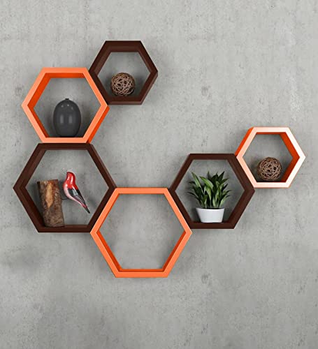 WOODEN Hexagonal RECTANGLE DECORATE YOUR LIVING ROOM (Set of 6 Orange Brown) Floating Shelves