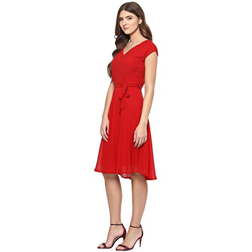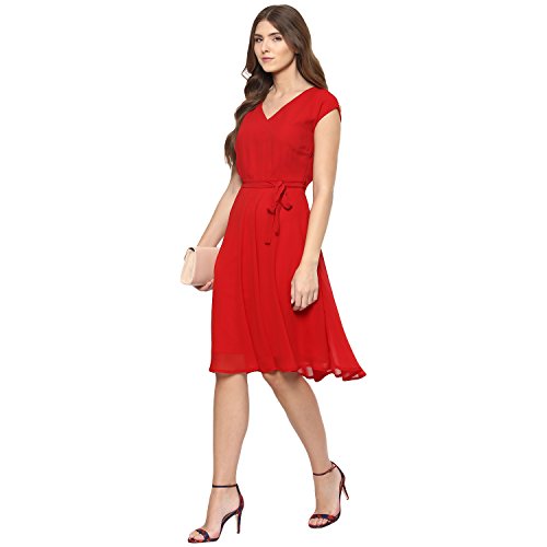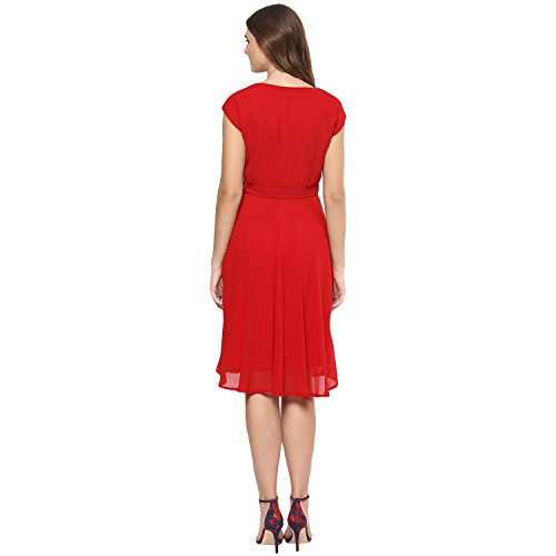 The harpa dress in red with a mock overlap at front is a midi length dress with a v neck. The trendy dress length has a circular skirt part and a belt at the waist. This is best styled with black pumps and a million bucks’ smile.