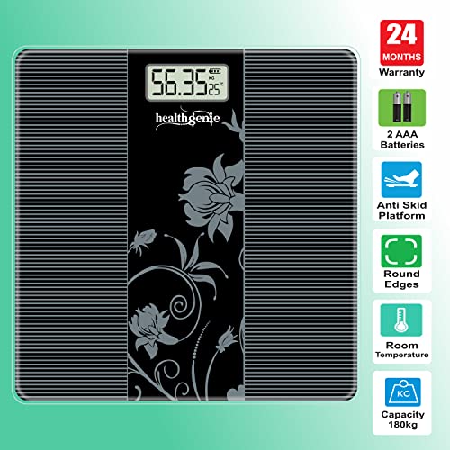 Healthgenie HD-93 electronic digital weighing scale,bathroom personal weighing scale – (Black) can be used as digital bathroom scales. The design is fashionable black with flower printed vertically which makes it beautiful and having anti-skid platform on jet toughened glass surface with curved edges for added safety.Reliable features of Healthgenie Weighing Scales are Large LCD display shows weight, room temperature and battery status,error, Low Battery indicator.5kg-180kg weight is the weight range,3 measuring units kg/lb./st (Press button at bottom to switch), Step-ON Technology, Error, Low Battery indicators & Auto Off are the some best features which makes it best scale.It have 2*AAA lithium polymer battery for greater life so no worry to charge it again.To calibrate the weighing scale place the weighing scale on hard, flat surface and initialize by pressing one foot on the platform until random numbers appear on screen,remove foot as it returns to zero (0.0),Now weight yourself.The best time to measure body weight is morning as weight tends to fluctuate throughout the day as per food and liquid intake.Weight variations : It is suggested to always ignore the first reading for calibration every time for best accuracy.