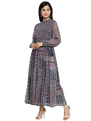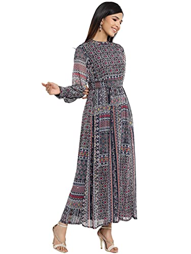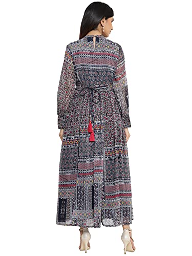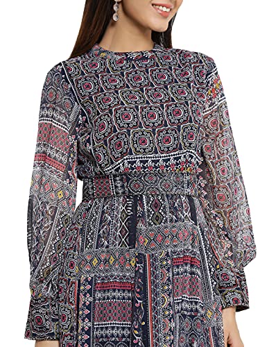 Juniper Navy Chiffon Placement Print Flared Dress with Tie-up Belt