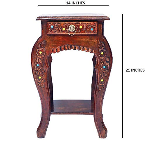 KK COLLECTION art India presents brand new 100% wooden and attractive designs side end table . It give a nice and beautiful look to your living room and bedroom. The table is made up of is made mango wood and it fits right in with both modern and traditional home decor. It look beautiful in brown shade natural wooden antique look. Size ( 21 x 14 x 14 inches ) with drawers storage and Shelf For Storing Small Things Like Remote Controllers, Snacks And So On. vase on top any style would look great. The table looks clean elegant and stable .The clean and sleek look would not be a disappointment the practical design of the table can either be used as desk, phone table, night stand table, sofa end table or bed side table beside your furniture or as a center piece in your living room. Round table is a multi functional table and can be used in each and every corner of your home .This Please take care when handling or moving the furniture as careless handling many cause damage or injury . Always remove dust with a dry cloth . When using the surfaces for serving food drinks it is best to use coasters or protected mats.This SIDE End Table Is Tested Rigorously On Various Standards to Bring You The Sturdy And Durable Quality Furniture You Deserve. Side Table Material : MANGO Engineered Wood | Color: Walnut Brown | Dimensions: 14 INCH (Width) X 14 INCH X 21 INCH (Height) DESIGNED FOR EVERY HOME – Simple Stylish Design, Functional & Suitable For Any Room | Offers Surface Storage, Side Table For Bedroom & Living Room Drawing Room standard size antique look handmade side end stool