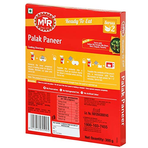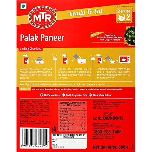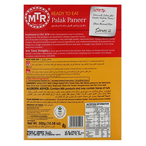 The instant and quick hunger reliever that comes in a hygienically processed packets, offers the best treat to the vegetarians. MTR ready to eat palak paneer consist of tender chunks of cottage cheese in a fresh green spinach gravy, ideal for serving or consuming with naan, roti, chappathi, paratha or rice.