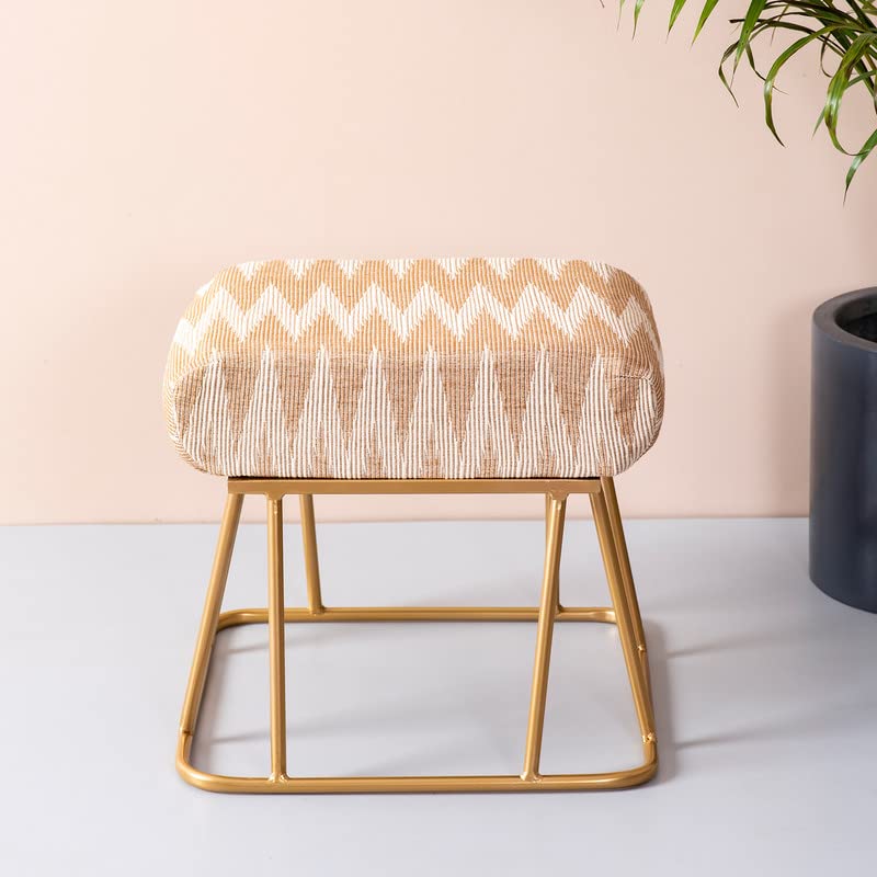 MATERIAL, DIMENSIONS and SET SIZE: [Material] Fabric – Cotton with Woven design; Legs – Designer Iron Legs with Golden powder coating; [Dimensions] Length – 14 Inches, Width – 12 inches , Height – 14 Inches; [Set Size] 2 Stool; [Country of Origin] Made in India