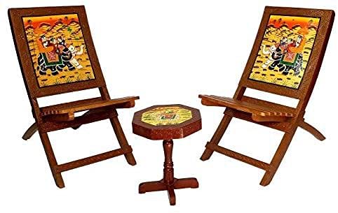 Rajasthani Handmade Wooden Antique Designer Folding Chairs and Table Set for Home|Office| Garden| Outdoor| Indoor| Balcony| Lawn|Outdoor Sitting , Multicolour – Set of 3