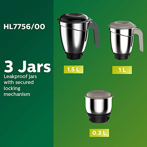 No of Jars: 3; Jar Size: Wet Jar (1.5 Litres), Multipurpose Jar (1 Litre), Chutney Jar (0.3 Litres); Jar Material: Stainless Steel; Body Material: ABS; Blade Material: Stainless Steel; Speed Control: 3 Speed Control + Pulse