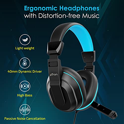 Hi-Fi Stereo Sound Output: High precision 40mm powerful sound drivers bring you vivid and clear sound in the game. pTron Studio Lite gaming headset lets you hear the footsteps of the enemy, gunshots and explosions. You can pinpoint the position of the enemy and have an immersive gaming pleasure.Adjustable HD Microphone: Position the microphone where it picks up your voice best. Adjust it out of the way when you’re on a call or playing a video game. Wear it your way on your left or right side. Note: Phone calls should be accepted/disconnected through your device.Lightweight Comfortable Design: Comfortable over-the-ear wired headphones with a great seal that minimizes outside noise so you can hear the beats clearly. Soft cushion padded earmuffs and lightweight headband provide a comfortable long time wearing experience. The size of the headset is easily adjustable for different heads that bring the most comfortable experience to gamers.Enjoy Gaming without Noises: Closed earcups design covers the entire ear and cuts external sound very effectively, allows you to focus on playing games without being disturbed.Multi-purpose Wired Headset: pTron Studio Lite gaming wired headphones with mic are versatile. You can use it for listening to music, talking on the phone, playing video games and e-learning or online classes.Integrated Volume Controller: On-the-earcup mounted wheel helps in increasing or decreasing sound level. Just scroll up or down.Plug & Play: No need to set up or install. Just connect the 3.5mm aux jack to your device for instant use and enjoyment. Universal 3.5mm connector is suitable for Smartphones, Tablets, PC/Laptops.Durable 1.3 Meter Long Cable: PVC wire is thick and strong, helping to extend headphone life by decreasing friction and preventing water splash or sweat from outside