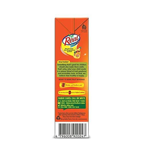 A good mixed fruit juice brings together the best qualities of different fruits while retaining a unique taste of its own. Your kid will love the stand-alone tangy-sweet taste of Real Mixed Fruit and will always ask for more. Make it a daily habit for him, because he might be fussy with fruit salads and cut fruits, but would never say no to the invigorating taste of Real Mixed Fruit. Every time you pour him a glass of Real Mixed Fruit, you can be sure that only the best Real Fruit Power would reach him. That is because every glass of Real Mixed Fruit is loaded with the goodness of 9 nutritious fruits, namely Passion Fruit, Apricot, Mango, Banana, Pineapple, Guava, Orange, Apple and Lime. Isn’t that great? The lushness of 9 fruits in 1 pack not only gives you all the nutrition but also makes you feel recharged. It is this unmatched combination of unique taste & super nutrition that makes Real Mixed Fruit, one of the highest selling fruit beverages in the country. Besides, it can also be used in the preparation of one of the most refreshing summer drinks known as the Mixed Fruit Punch. It is an amazingly made, healthy blend of fresh fruits, packed with much energy. Its great taste is very filling and full of health benefits. So, relish your meals with the Real Mixed Fruit.