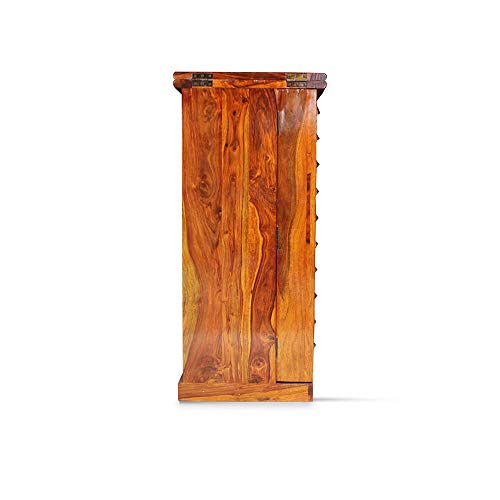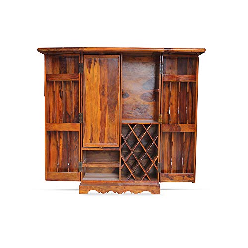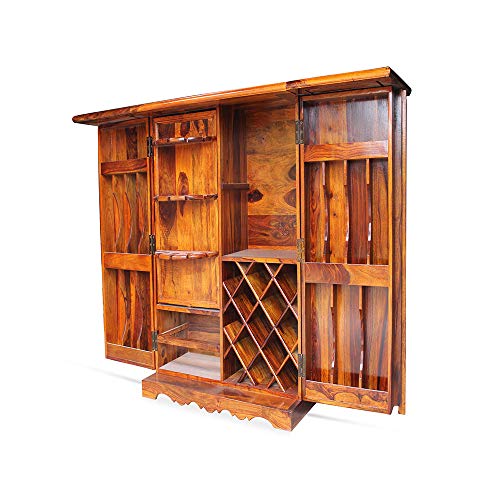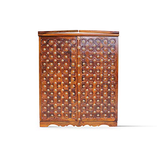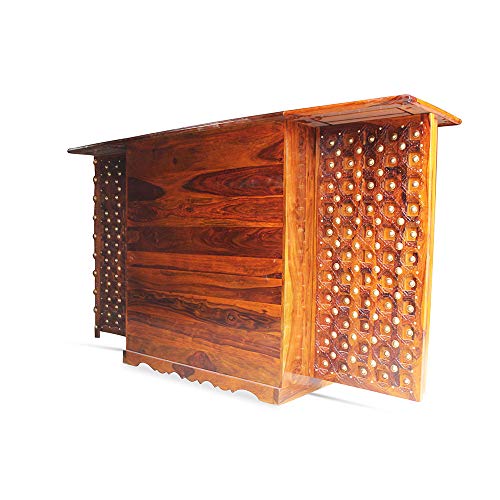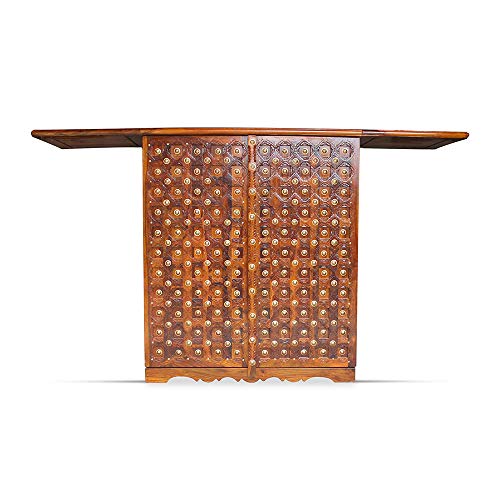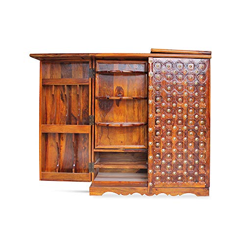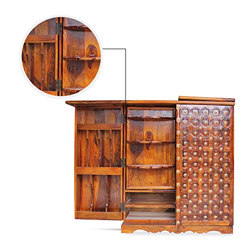 Overview: This Beauty Packed Bar Stand is an essential Piece of Furniture for those who appreciate true craftsmanship. The bar stand holds a lot of space to keep all your Antique Collection of wines and scotch. Look compatible when closed down, but once it gets unfold, the Space and uses are very easy to understand. This bar stand includes the Royal Rajput craftsmanship. The beautiful nail work on the top is inspired by Shekhawati culture. So go ahead and make this beauty a part of your interior. Material: The Royal Finish Rajputi Bar Stand is made up of premium quality sheesham (rosewood) wood which are taken from well-procured forests. Uses and Care Instructions: The Royal Finish Rajputi Bar Stand is mainly used to keep wines, scotchs, whiskey, goblets etc. However there are couple of things which needs to be taken care of. Don’t put objects like burning candles or iron on furniture as it will make the finish vanish really quickly. Don’t put the bar stand where it is exposed directly to sunlight as it will make the furniture’s life short. Put pad or coaster to place hot objects on the bar stand.