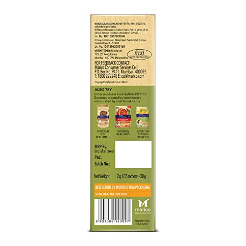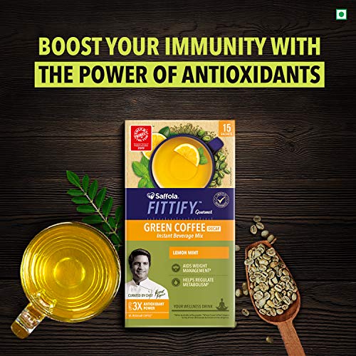 Saffola Fittify Gourmet- Green Coffee instant beverage mix helps support immunity, aids in weight management (refer pack) and also helps regulate metabolism, making it a healthier beverage to include in your everyday diet. It is made from unroasted green coffee beans that has up to 3X antioxidant power in comparison to regular roasted coffee, making it the healthier coffee. This healthy instant coffee mix is available in 5 refreshing flavors of Lemongrass Lavender, Lemon Mint, Ginger Basil, Classic Strong Coffee & Classic Coffee. It comes in easy to carry sachets and even easier to make, making it a perfect wellness drink that can be consumed any time of the day. Empty the Green Coffee powder sachet into a cup, add 150ml of hot water, stir well and dissolve. You either consume it hot or you can have it as a cold brew. At Saffola FITTIFY Gourmet, we believe in adding more nutrition to your food and more flavor to your life. With this motto, our range has been carefully created by nutritionists and curated by Chef Kunal Kapur to combine the best of taste with health for a slimmer fitter life.