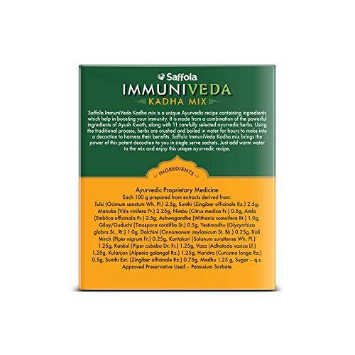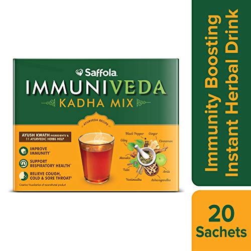 Saffola ImmuniVeda Kadha mix is a contemporary ayurvedic recipe made from Ayush Kwath ingredients Tulsi, Dalchini,Kalimiri,Sunthi and 11 Ayurvedic herbs which help boost immunity
