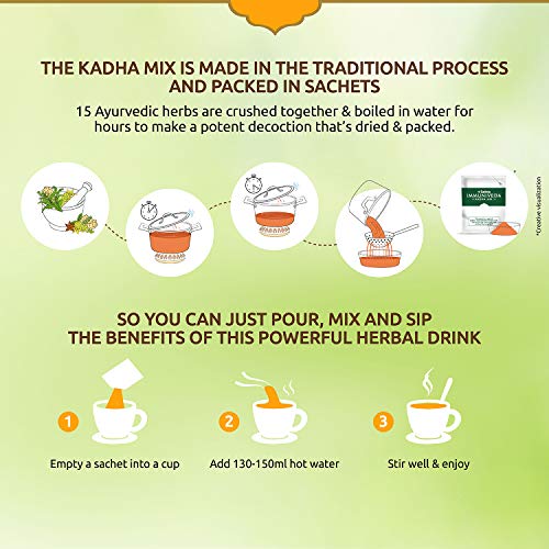This unique Kadha is made in the traditional way, the 15 herbs are crushed and boiled in water for hours to make a potent decoction, that’s packed into single serve sachets for you