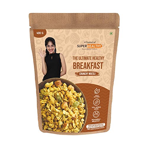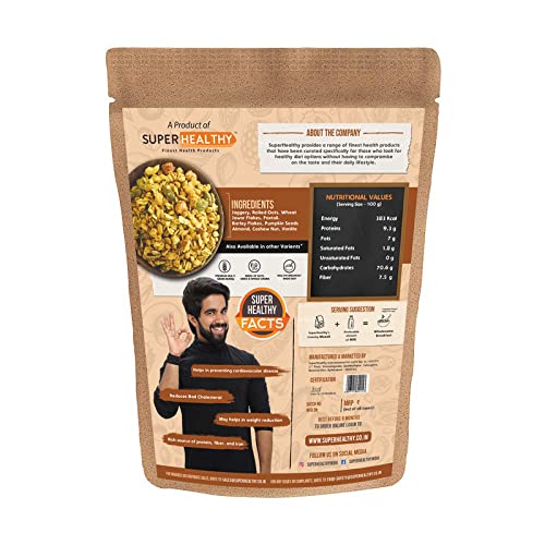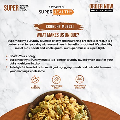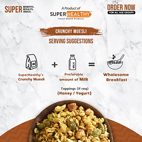 What makes SUPER HEALTHY UNIQUE? Superhealthy Crunchy Muesli is a tasty and nourishing breakfast cereal. It is a perfect start for your day with several health benefits associated. It’s a healthy mix of nuts, fruits, and whole grains, our super muesli is super-light and super flavorful. Boosts Your energy SuperHealhty’s seeds and berries muesli is a perfect breakfast that satisfies your daily nutritional intake Highly nutritious and low on calories, it’s the healthiest start to your day.High in minerals like calcium and magnesium which helps in keeping your bones strong Rich source of fiber. Provides necessary antioxidants to the body.SuperHealhty’s seeds and berries muesli is low in carbs and cholesterol which helps in preventing the risk of cardiovascular diseases No Artificial Flavours, Colours, or Preservatives. Just the goodness of All Natural Ingredients 12.9g Protein, 69.9g Carbohydrates, 1.5g Saturated Fats, 411.5 Kcal Energy, 8.2g fiber, 7.3g Unsaturated Fats, 8.9 g Total Fat. Rolled Oats, Jaggery, Jowar Flakes, Bajra Flakes, Watermelon seeds, sunflower seeds, Dried Strawberry, Flaxseed, Chia Seed, Dried Blueberry, Strawberry Essence, Food Colour