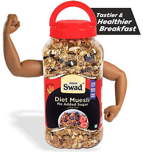 Swad presents its exclusive range of Tasty & Healthy Breakfast Cereals. Swad Diet Muesli No Added Sugaris made with the Goodness of Multigrains in a Zero Cholesterol formula to keep you charges up all day long. 100% Natural Ingredients, Multigrain Power, No Preservatives, Rich in Fibre, Vitamins, Iron & High in Protein. It tastes great with hot or cold milk, yoghurt, ice creams or enjoy it as a snack with children, kids, friends & family. Available in 12 unique flavours: Corn Flakes, Honey Cornflakes, Chocos Flakes, Chocos Vanilla Flakes, Diet Muesli, Muesli Fruit & Nut, Chocolate Fills, Chocos Vanilla Fills, Strawberry Fills & Fruit Loops Rings & Fruit Balls. Swad Breakfast Cereal, Diet Muesli No Added Sugar [Multigrain Crunchy Oats, High Fibre, High Protein, Zero Transfat & Zero Cholesterol Muesli]Try all 12 Swad Breakfast Cereals to experience Tastier & Healthier Breakfast everyday.