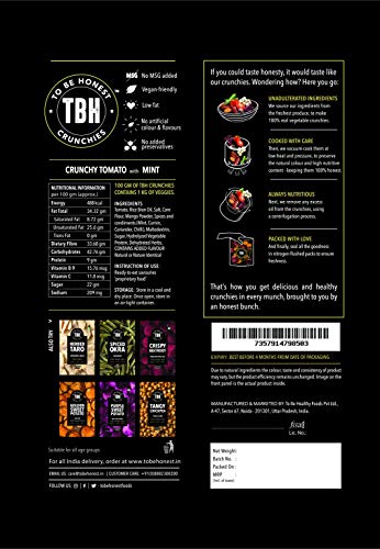 Package contents: 60 gms of Crispy Beetroot Chips seasoned with Himalayan Rock Salt, 28 gms of Crunchy Tomato Chips seasoned with mint, 85 gms of Herbed Taro chips seasoned with oregano and basil, 25 gms of Spiced Okra Chips seasoned with Coriander, 90 gms of Golden Sweet Potato Chips seasoned with Peri Peri, and 90 gms of Purple Sweet Potato Chips seasoned with Pani Puri Masala.