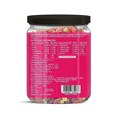 “We are what we eat” is a proverb worth remembering, especially when it comes to leading a fit, healthy and happy lifestyle. And when you can get your daily dose of health from mouth watering and naturally sweet berries, aptly known as Nature’s Candy, it’s super easy to eat right without compromising on the ‘Joy of Taste’. Made with lip smacking assortment of the choicest exotic dried berries, our Daily Dose Berry Mix not only helps you get that dose of anti-oxidants, fibre and a host of micro-nutrients but also keeps you energised for hours. Enjoy the melange of delicious and nutrient dense Strawberries, Cranberries, Blueberries, Goji Berries, Raisins and you have the tastiest, sweetest, healthiest snack ever. Sprinkle 2 scoops on your morning cereal or have them to satiate that sweet desert craving or snack them as it is out of the jar! Go ahead and scoop all the goodness.