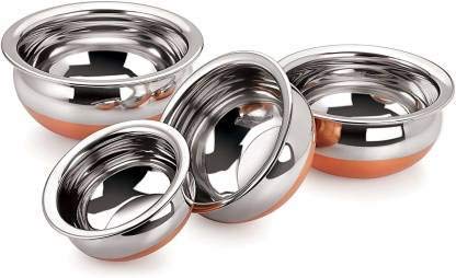 stainless Steel Bottom Copper Punjabi Copper Handi Bowl:- The Copper Handi Bowl is made of good quality materials which sure to add to its durability. It is highly stable and can stand strong. Perfect copper handi big size Set for Everyday Use Whether you want to cook a delicious serving of your favourite sabzi, biryani or heat leftover curries from the previous day, the 5-piece copper handi Bowl set from Rufix is the ideal solution for a wide variety of cooking requirements. Available in a set of Five handis featuring capacities of 500ml, 800ml, 1000ml, 1200 ml, 1600 ml, respectively, you can use this cookware set can be used for a multitude of purposes with equal ease. Stunning Design with Durable Body With a mirror polish steel finish and an extremely sturdy body, the Rufix- copper handi set adds to the overall decor of your kitchen space. Featuring a stainless steel body and a thick gauge copper base at the bottom, this handi set is the perfect combination of style and substance. The unique design of these handis ensures even distribution of heat, thus avoiding burning of food and providing a more fuel-efficient solution for your cooking needs. Along with being perfect utensils for cooking food, it can also be used to serve your meals in a stylish manner. Easy to Clean and Maintain Thanks to the durable material used in the 5-piece copper handi pot set from Rufix, washing and maintaining it is a relatively easy task. Simply use a mild soap detergent and keep it looking new for a long time even with regular use. This Copper Handi set is ideal for Cooking Serving Pot Biryani Handi a wide range of Indian, Traditional and Western dishes. These are easy to clean, tough and long last