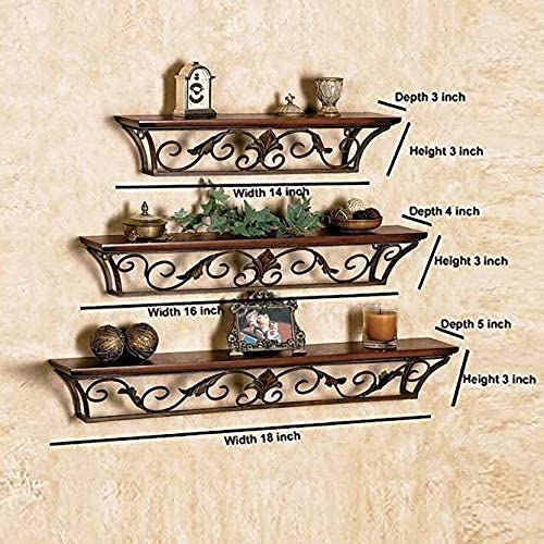 PACKAGE – 3 Pieces of wooden wall shelf with dimension Large- Width (18 in) Depth (5 in) Height (3 in), Medium- Width (16 in) Depth (4 in) Height (3 in), Small- Width (14 in) Depth (3 in) Height (3 in)