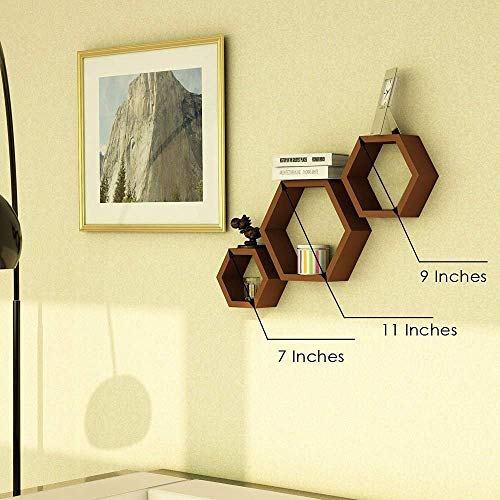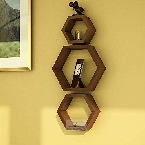 Woodkartindia Hexagon Shelf unit is the ultimate stylish yet functional piece for your living space. It offers a surprising amount of space for storing books, pictures, and other decorative items. Plus it just looks really cool. Made in the mid century modern style, with clean lines and an interesting geometric shape, it transforms your room just by being there. These Shelves can be arranged in any order to make a desired look of your choice. Scroll down to see some more amazing arrangements of these shelves. Features: Three different size shelves: 7-Inch, 9-inch and 11-Inch in diagonal dimensions. Hanging hardware included for easy mounting. No Assembly Required Wall Screws & Plugs