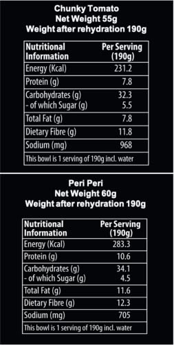 The meal bowls are ready in 4 mins by simply adding boiling water (no cooking required). And have a 12 month shelf life at room temperature (no refrigeration required)